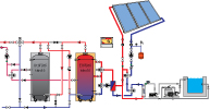Standard-Pool rendszerekA Standard melegvíz készítő rendszer kiegészítése medence fűtéssel. A napkollektorok a melegvíz-tárolót az alsó hőcserélőn keresztül, a medence vizét pedig a vízforgató körbe beépített lemezes hőcserélőn keresztül fűtik. A bojler és a medence fűtése közötti átváltás motoros váltószeleppel történik. |